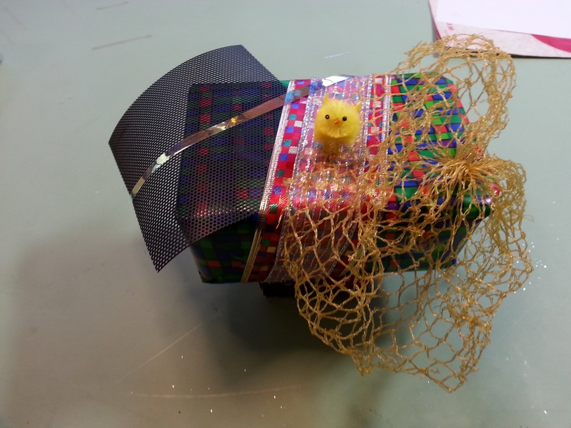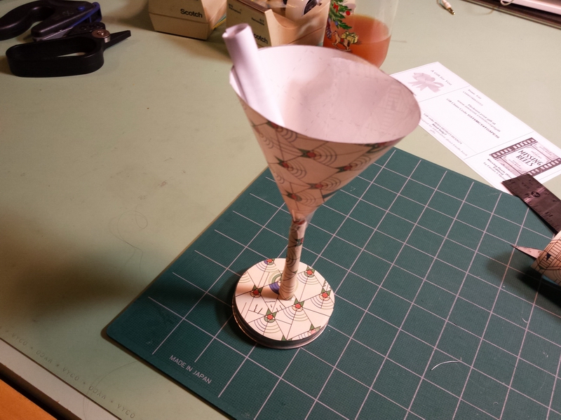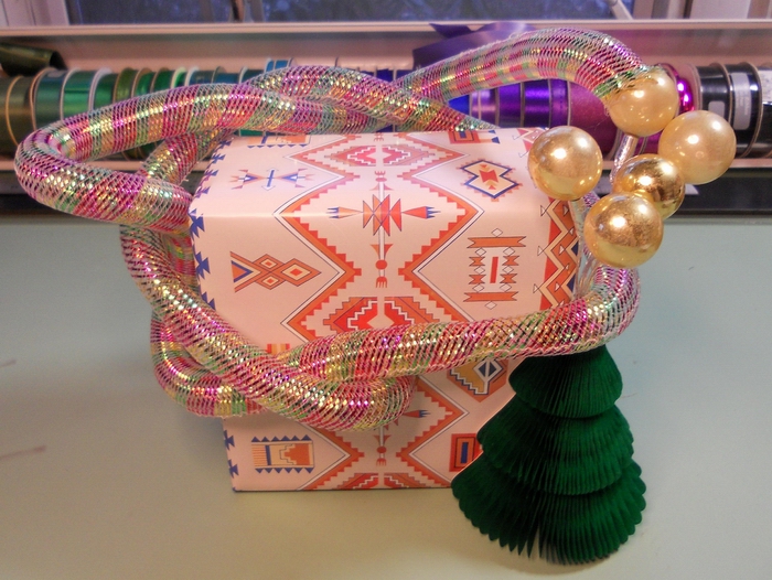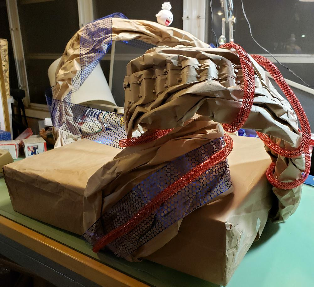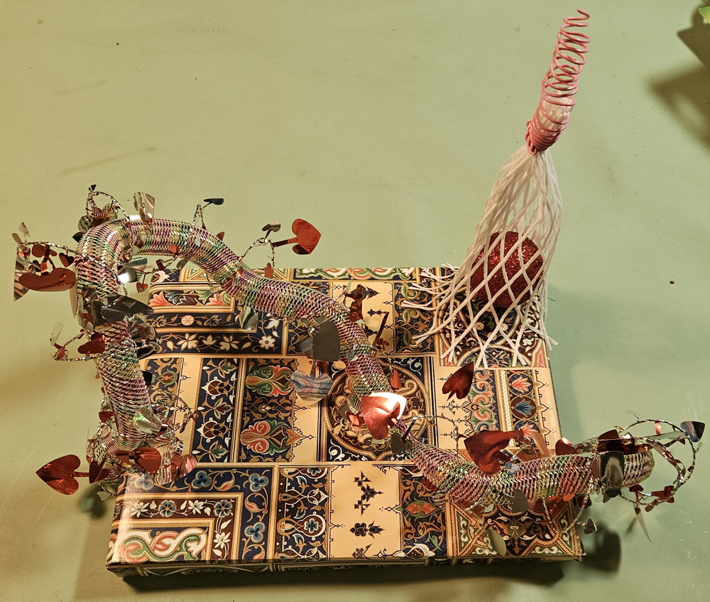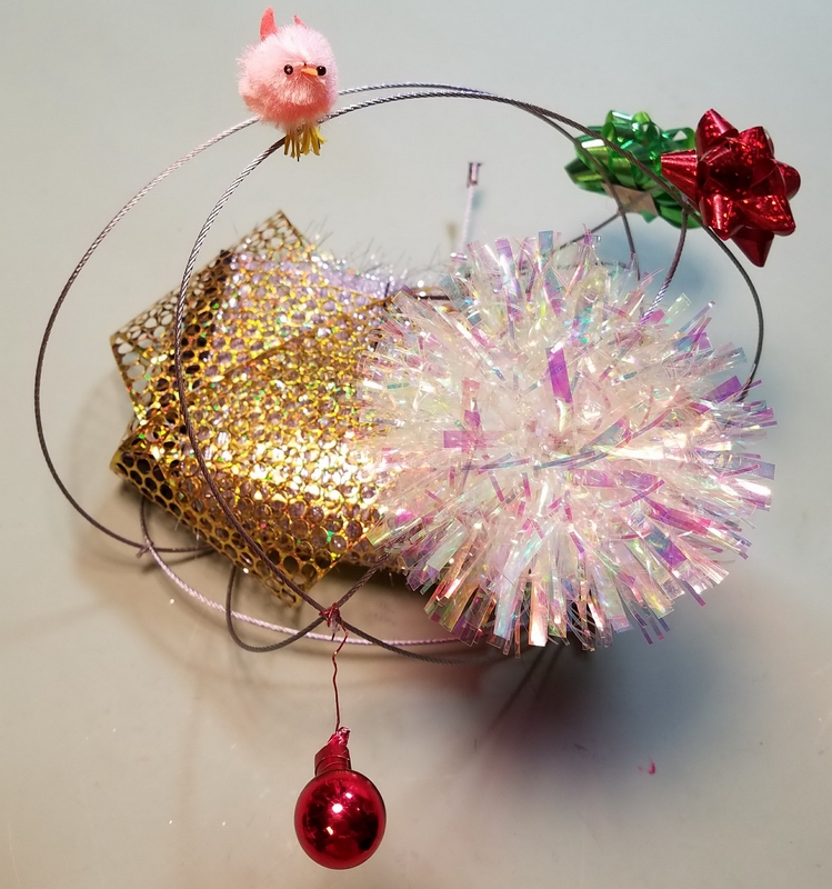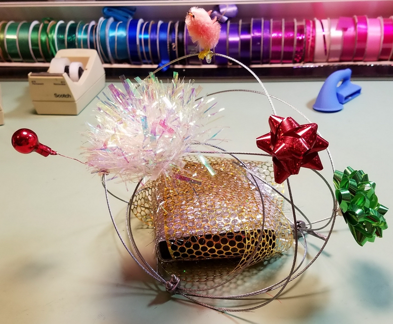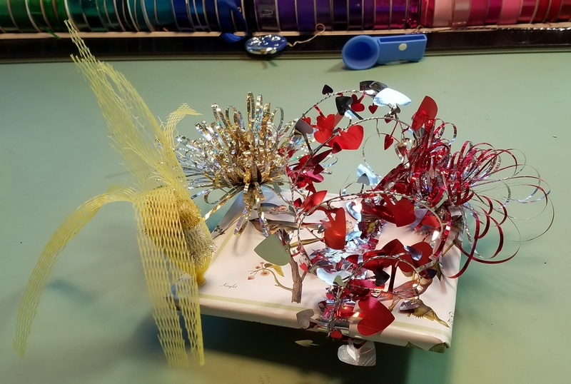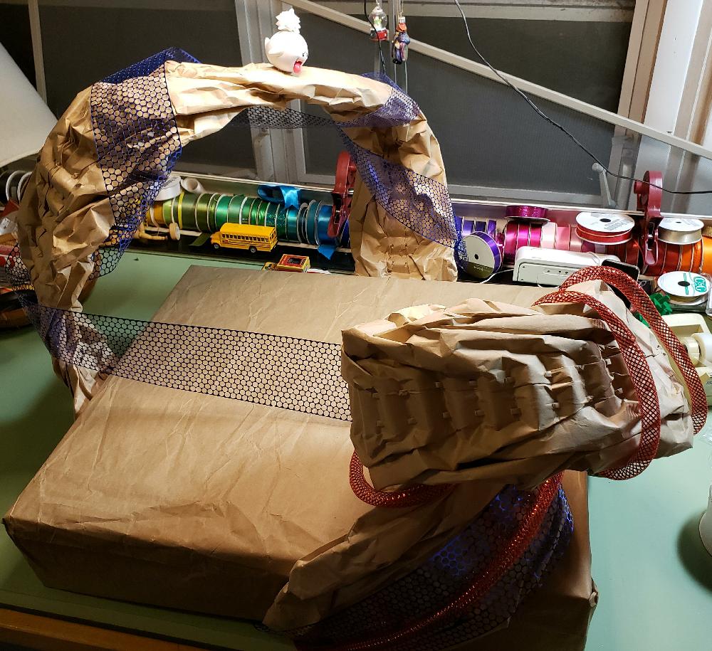 Prep: waiting for the glue-gun glue to set for one end of the wavy soaring thingy...