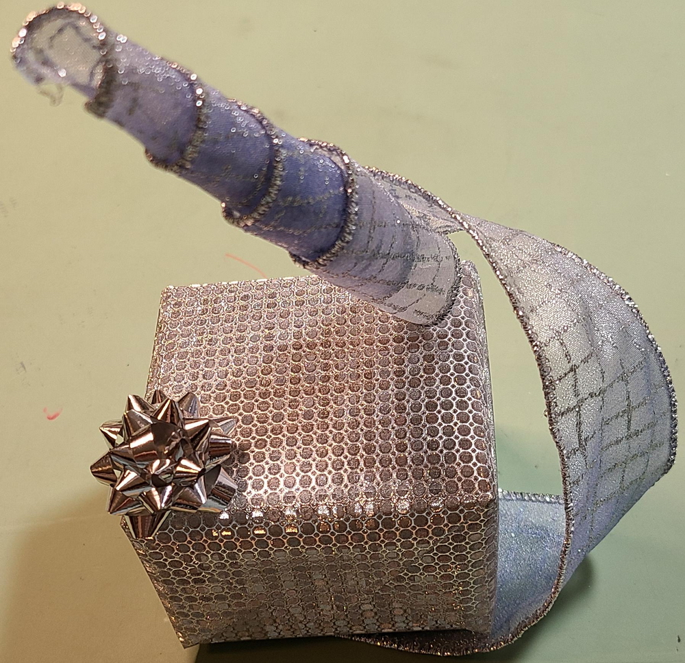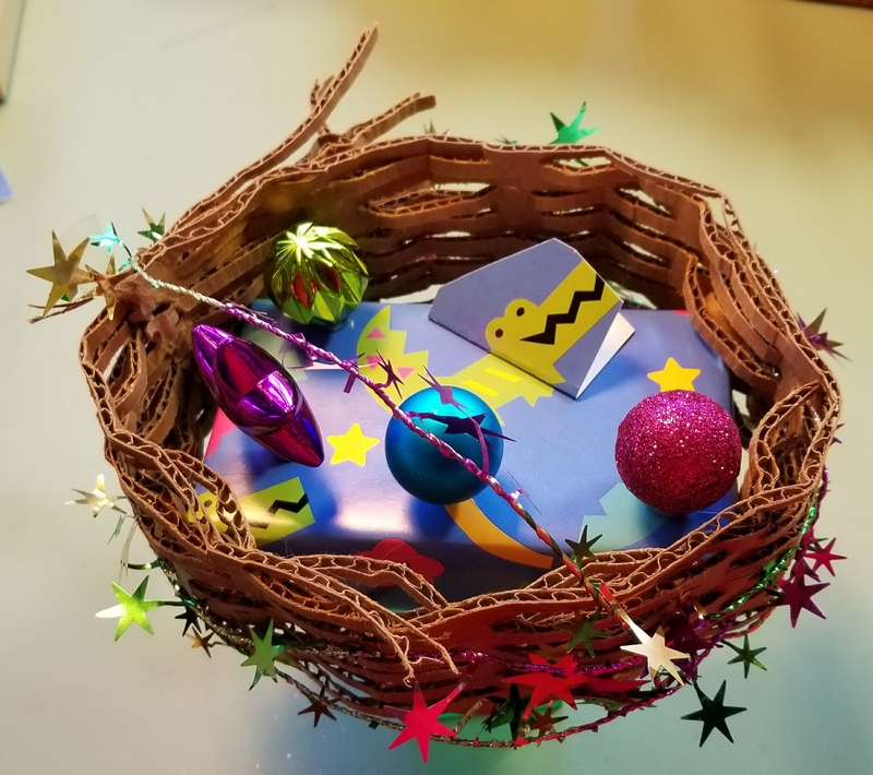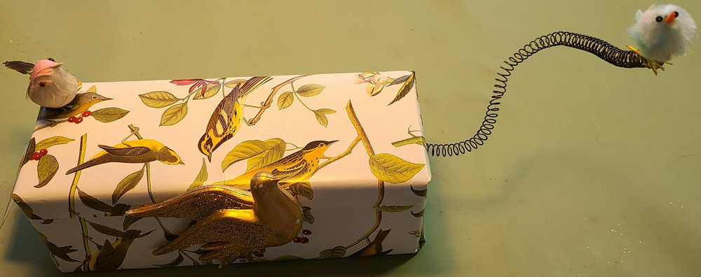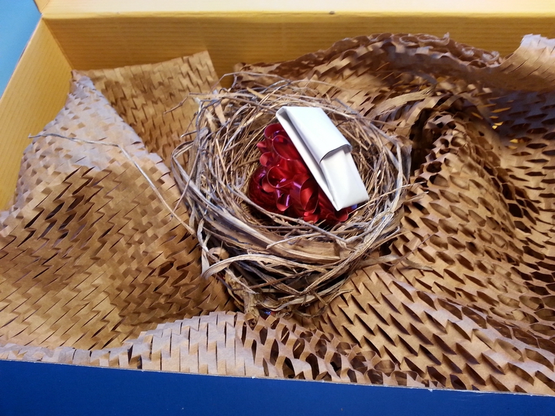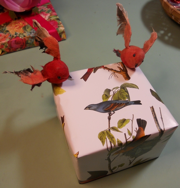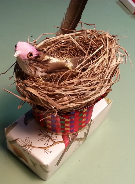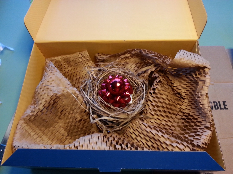 What's inside? A real bird's nest with a bow+ornament in it...